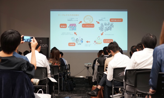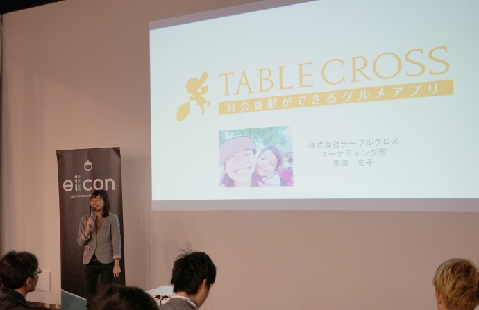 飲食店を予約するだけで、途上国のこどもたちに給食が届く社会貢献ができるグルメアプリ「テーブルクロス」。社会貢献と言うと、どうしてもカタくなりがちになってしまうが、飲食店予約という普段何気なく行っている日常行為に、社会貢献性を取り入れた新しいビジネスを展開している。同社からは、マーケティング部エンジェル倶楽部室室長の黒田氏が当日のピッチに臨みました。