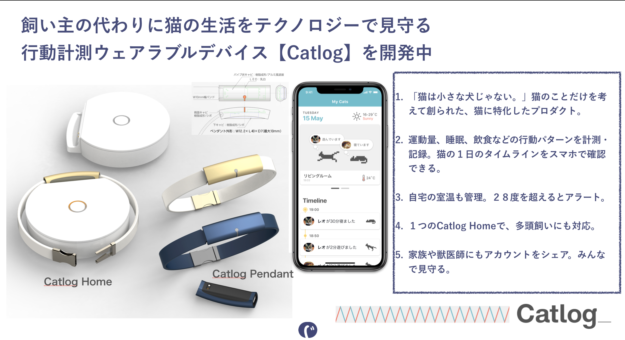 会社のミッションとしては「世界中の猫と飼い主が1秒でも長く一緒にいられるように、猫の生活をテクノロジーで見守る。」と掲げておりまして、現在は愛猫の様子を見守ってくれる、スタイリッシュな首輪型のウェアラブルデバイス「Catlog(キャトログ) 」の企画・開発を行なっています(2019年8月にリリース予定)