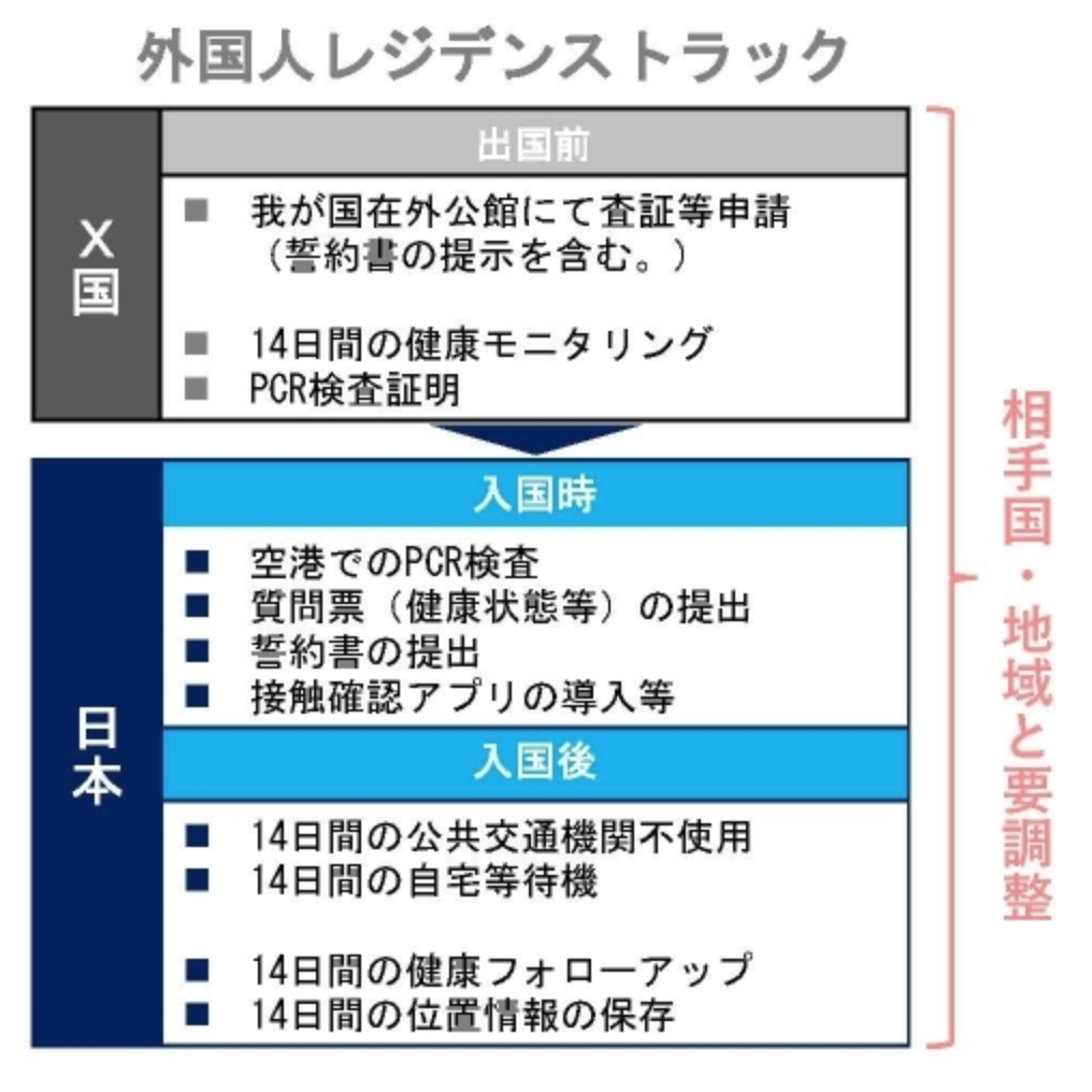 またその他、空港でのPCR検査や日本入国後14日間の健康フォローアップなどの仕組みが用意されているため、詳しくは以下の図をご参照いただき、担当機関にお問い合わせください。