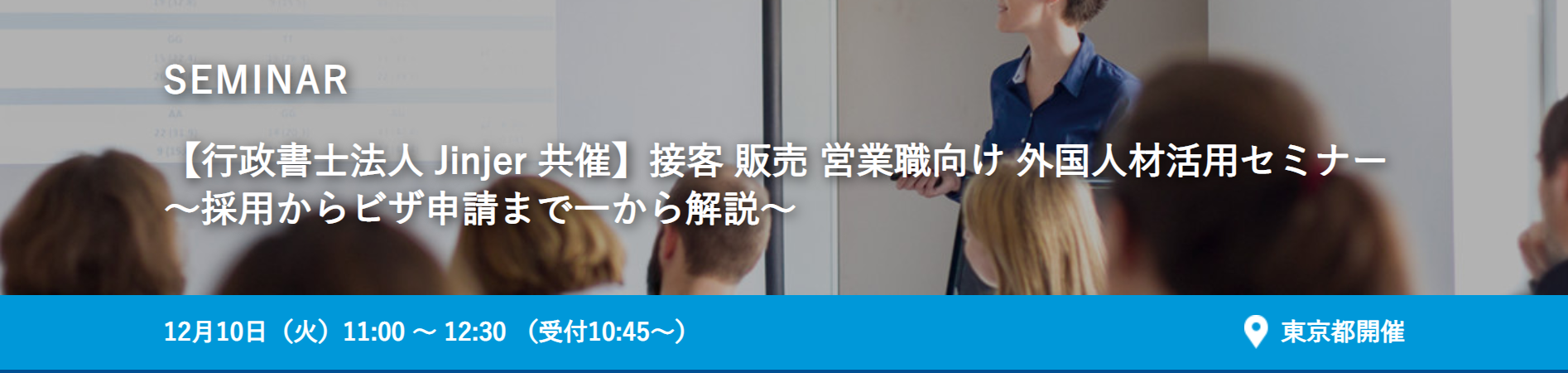 セミナー終了後は、採用コンサルタント及び行政書士との個別相談会もございますので、ぜひこの機会にご参加下さい♪(申し込みは画像をCLICK!)
