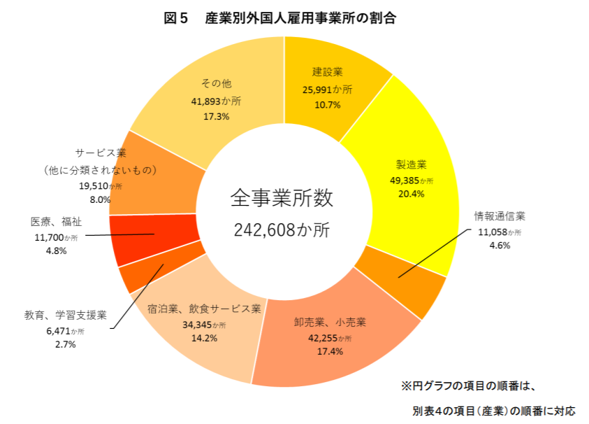 外国人労働者の増加とともに、外国人労働者を雇用している事業所数は 242,608 か所と同じく過去最高記録を更新しており、内訳として製造業や卸売業、宿泊業等の割合が大きいことがわかります。
