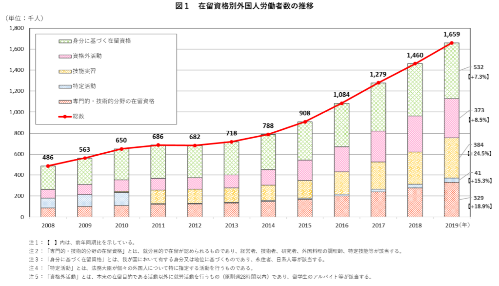 法務省が発表した資料によると、令和元年 10 月末現在で外国人労働者数は 1,658,804 人と過去最高記録を更新しました。