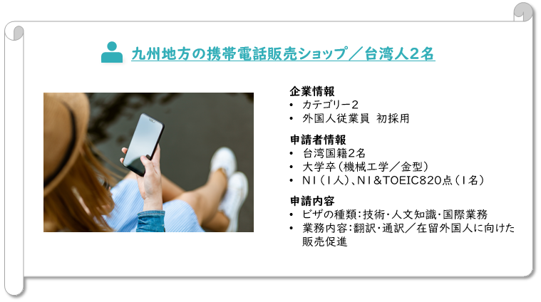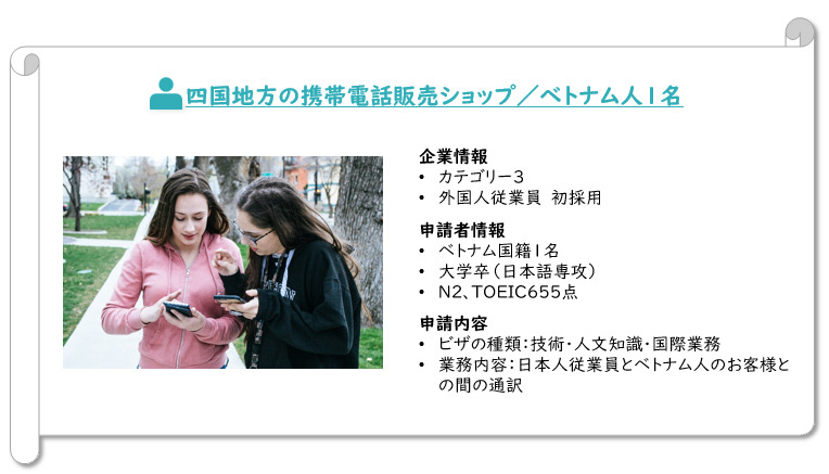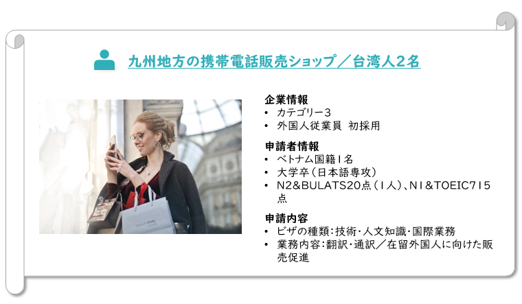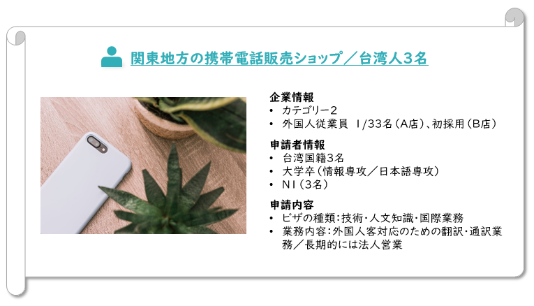 特に人気が高い「携帯電話販売ショップ」におけるビザ取得成功事例を集めています。