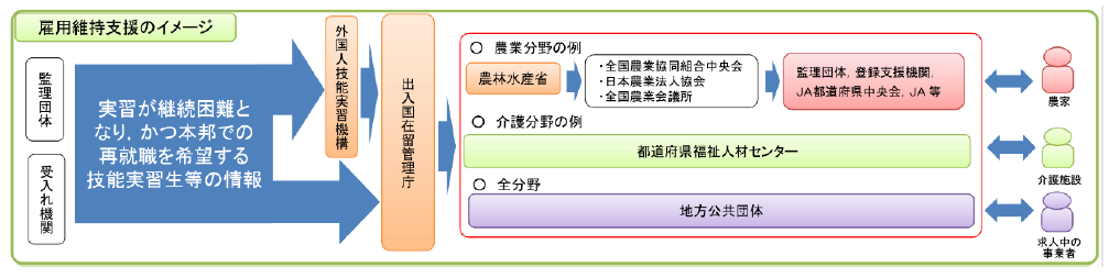 これは、新型コロナウイルス感染症の影響で解雇等された技能実習生及び特定技能外国人に対し、国内での雇用を維持できるよう、 2020年4 月 20 日より、在留資格「特定活動」を付与 し、 技能実習生や特定技能外国人の来日が延期になった企業への誘導する支援( マッチング) となります。
