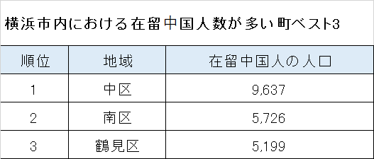横浜市の中でも、横浜中華街がある「中区」をトップとして、中区に隣接する「南区」、南米にルーツを持つ外国人など様々な国の出身者が集まる「鶴見区」の順で、在留中国人が多く居住しています。